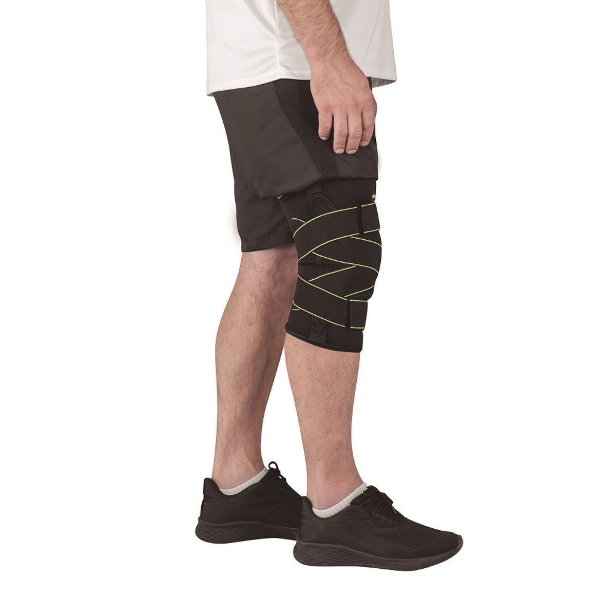 Confeccionada em Neoprene, a joelheira mantém a região aquecida, favorecendo a circulação e proporcionando uma sensação térmica terapêutica. É um produto ajustável e bilateral, podendo ser utilizado tanto no joelho direito quanto no esquerdo. Para identificar o tamanho adequado, recomenda-se medir a circunferência do joelho em ângulo de 90 graus. Os tamanhos disponíveis são: P para circunferências de 31 a 35 cm, M de 36 a 39 cm, G de 40 a 43 cm, GG de 44 a 47 cm e XG de 48 a 51 cm. A venda é unitária e o produto está disponível na cor preta, com detalhes em verde.